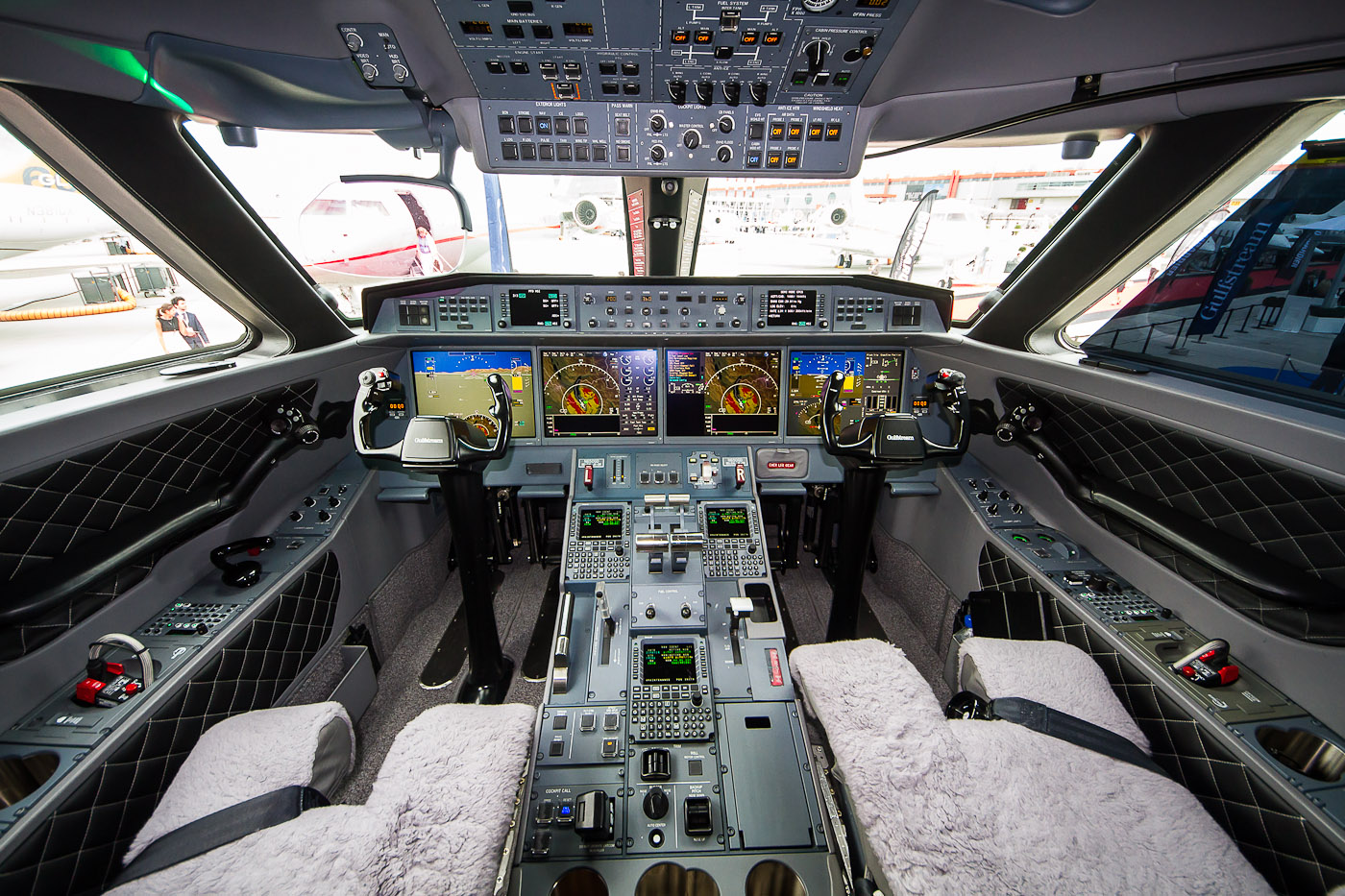 The cabin on this particular aircraft is the standard Gulfstream display cabin. The use of whites, grays, and coffee creams provides a feeling of understated elegance this is carried through onto the flight deck, which is one of the most impressive I have seen on any aircraft yet.