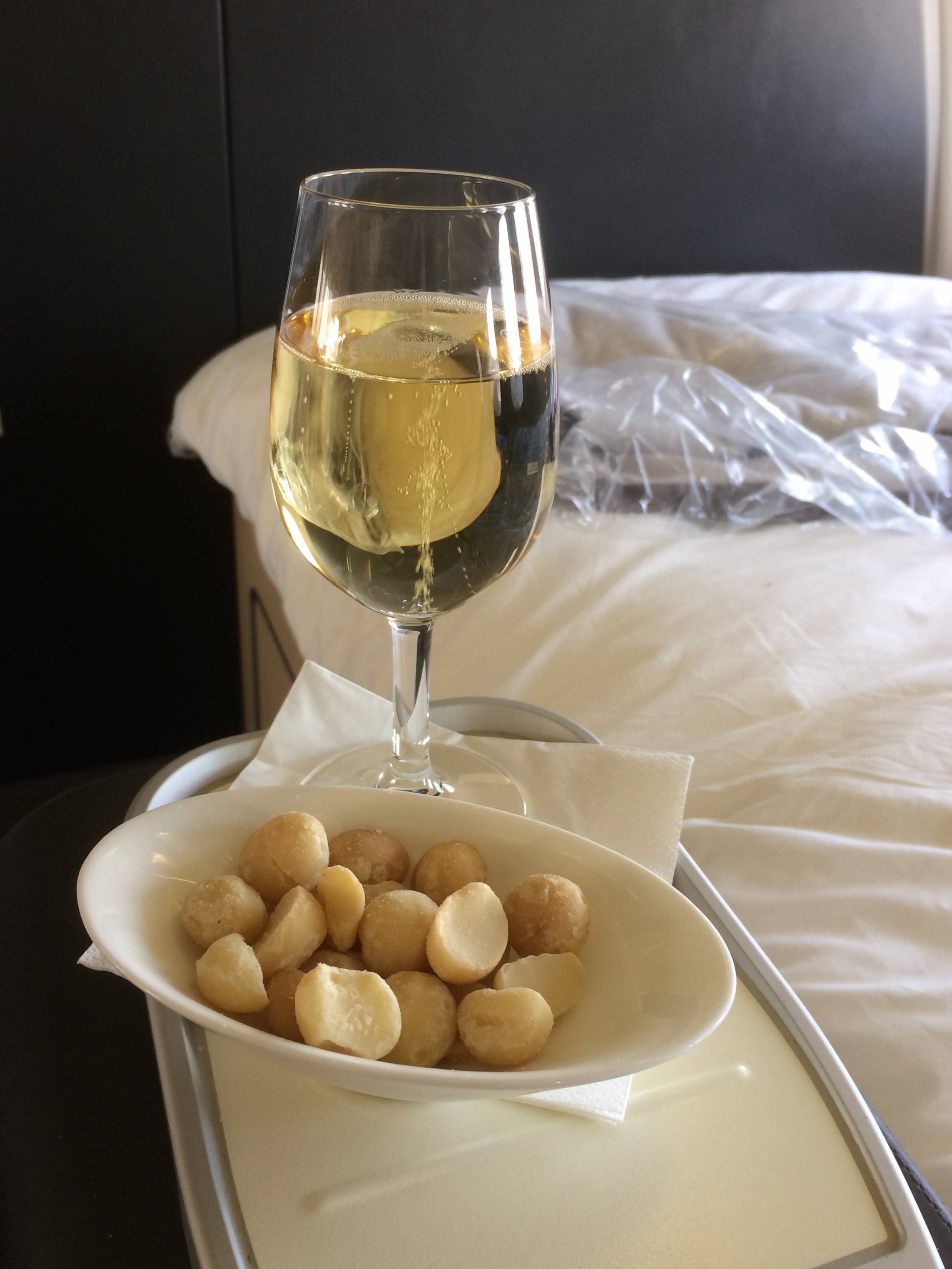 A glass of champagne with some macadamia nuts. Also, a glimpse of the wonderful bed. Photo: Bernie Leighton | AirlineReporter