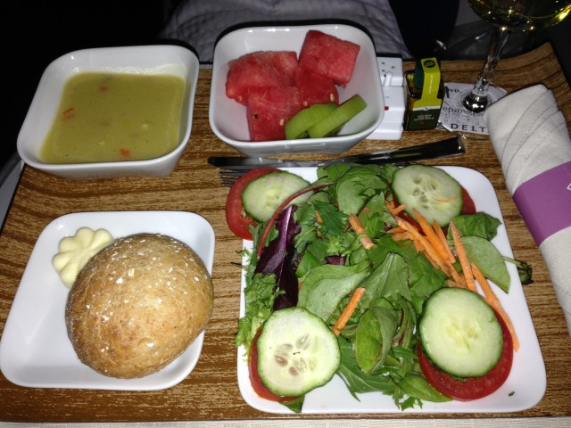 I had ordered a vegetarian meal ahead of time, which was too bad, because the food on the standard menu sounded delicious! It’s always a gamble for me whether to order a special meal or not.