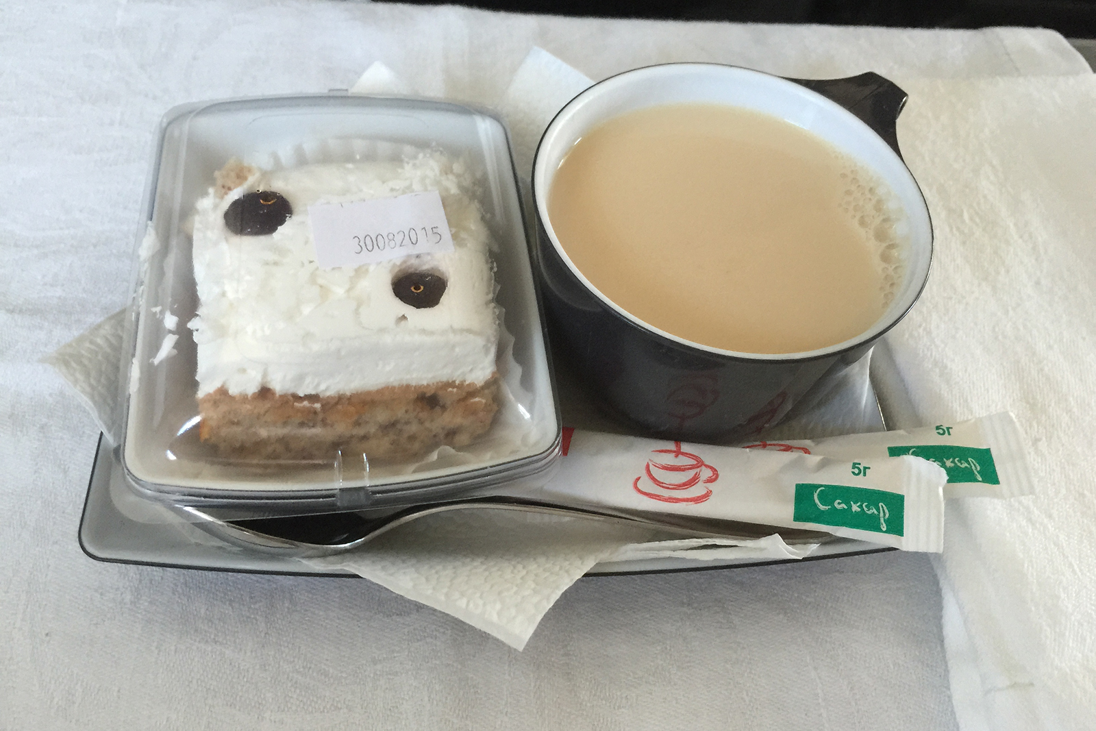 The first round of lunch was some sort of smoked freshwater fish, cheese, and walnuts with apricots. The catering was no Aeroflot, more on Belavia’s level. So, pretty good, but not outstanding. I think the sky blue paper with clouds on it made the experience.