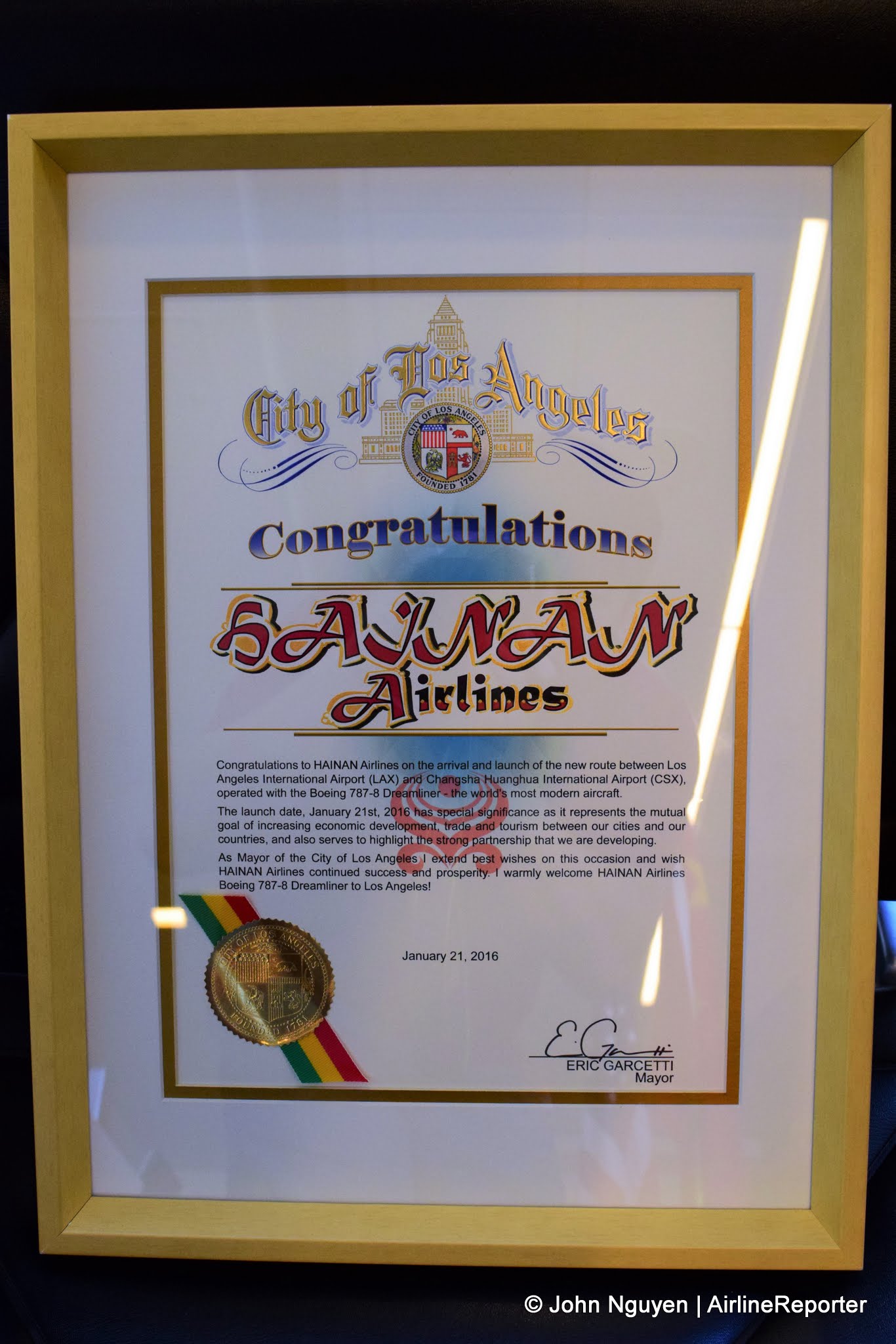 A certificate of congratulations from the Los Angeles Mayor’s Office, to commemorate Hainan’s new service from LAX to Changsha.