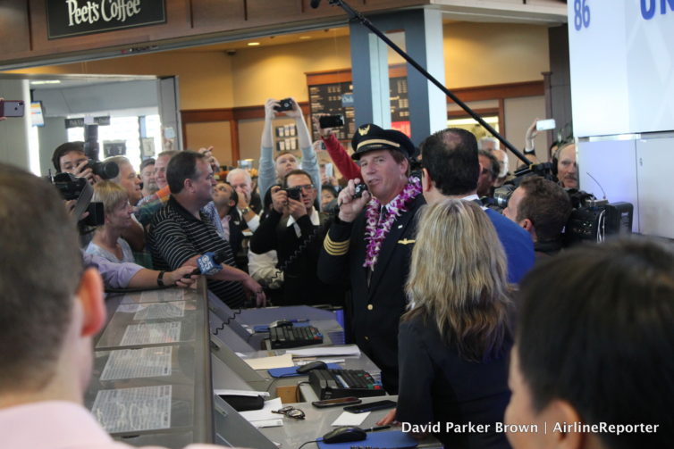 I arrived to SFO about an hour before the gate party started. I went to get some food and walked around before heading back to the gate to see some familiar faces. I feel like a broken record saying this in so many of my stories, but these sorts of events are so great because of the people. After doing this gig for almost a decade, I start to see the same faces at these events and it is great to catch up. Then I get to meet new people (including some of you readers), and talk about airplanes. What’s not to love?