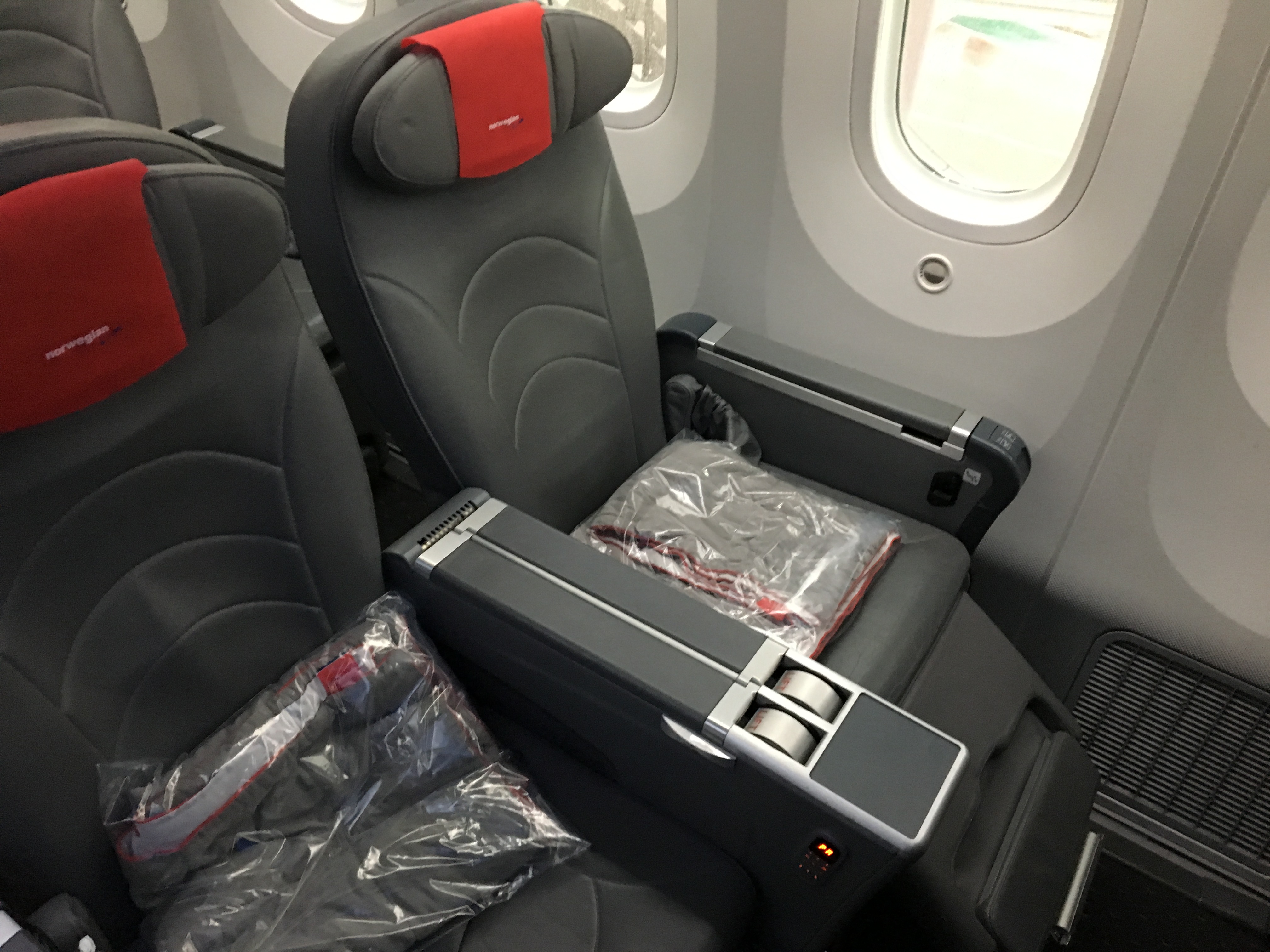 The premium cabin on Norwegian’s 787-9 has five rows of seven seats, in a 2-3-2 configuration (while the economy section is in the now-standard 3-3-3 configuration). The seat is definitely not a lie-flat experience; it is a comfy recliner with an adjustable foot rest and lots of leg room – better than domestic first class seats in the U.S., but don’t go in expecting a bed for your trip. For what it’s worth, the seat just felt sort of cheap. It was covered in vinyl, sort of like the chair at your dentist. In the upper back, a metal bar protruded. The tray table would not stow on its own without me messing with it.