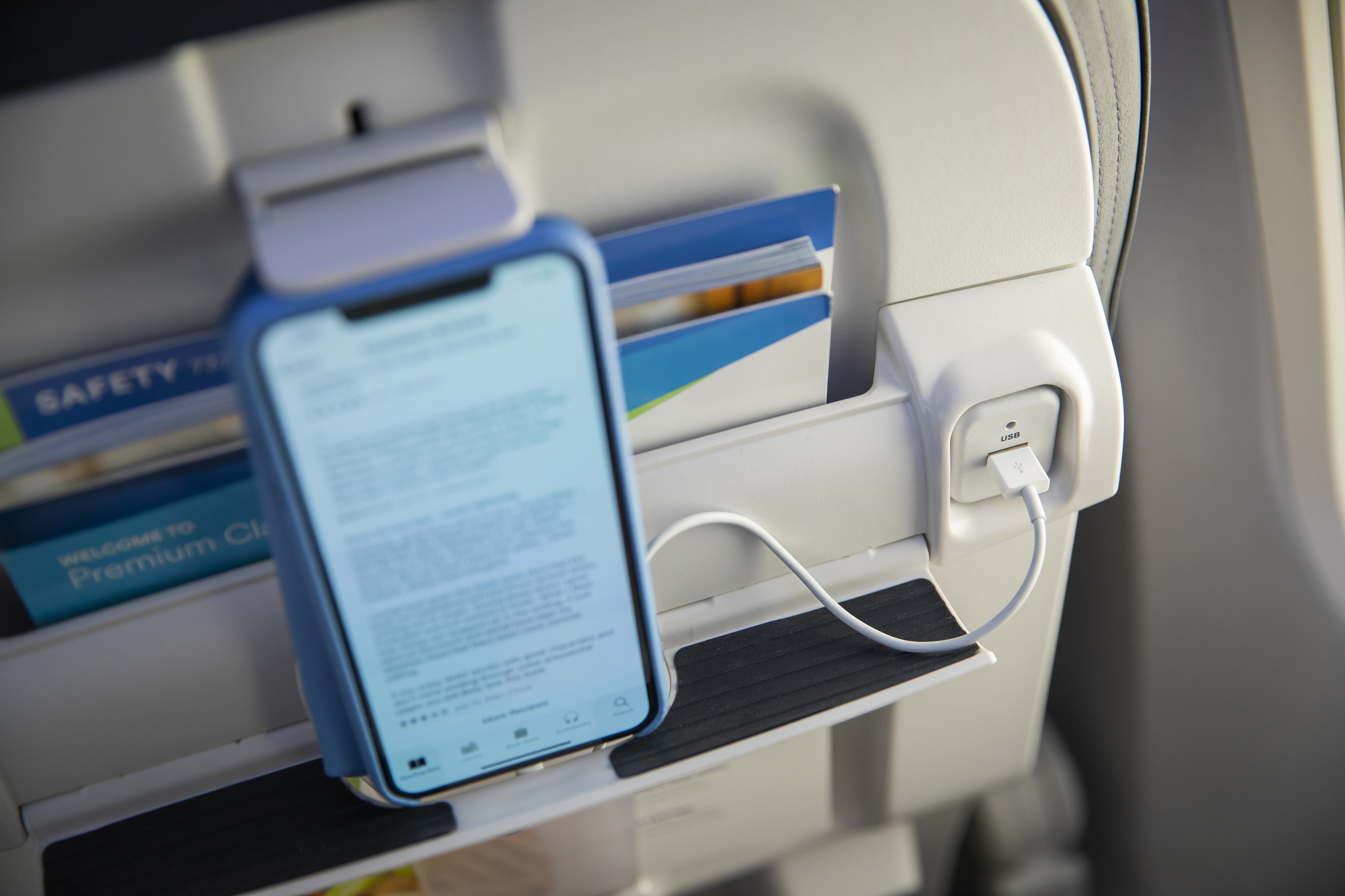 - Ergonomically-friendly tablet holders at each seat that accommodate most tablets and smartphones. The holders free up tray table space and an added shelf keeps devices in prime viewing position. Flexible mesh pockets also allow for easy access to essentials during the flight.