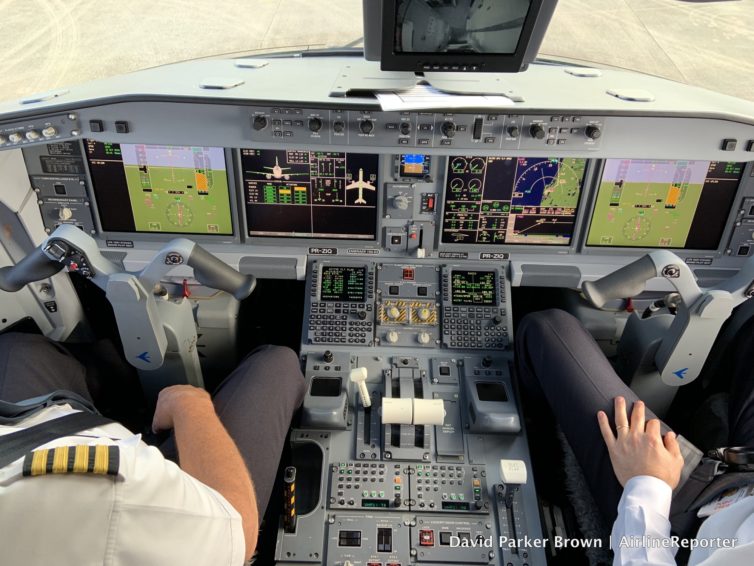 I will say at 6’1″ and 250-ish lbs, the jump seat is pretty cozy. But I was able to maneuver myself to make sure that my knees were out of the way. I said “hello” to the pilots and thanked them for allowing me to be in their flight deck, then I went silent. I didn’t want to cause any distractions for them during take off.