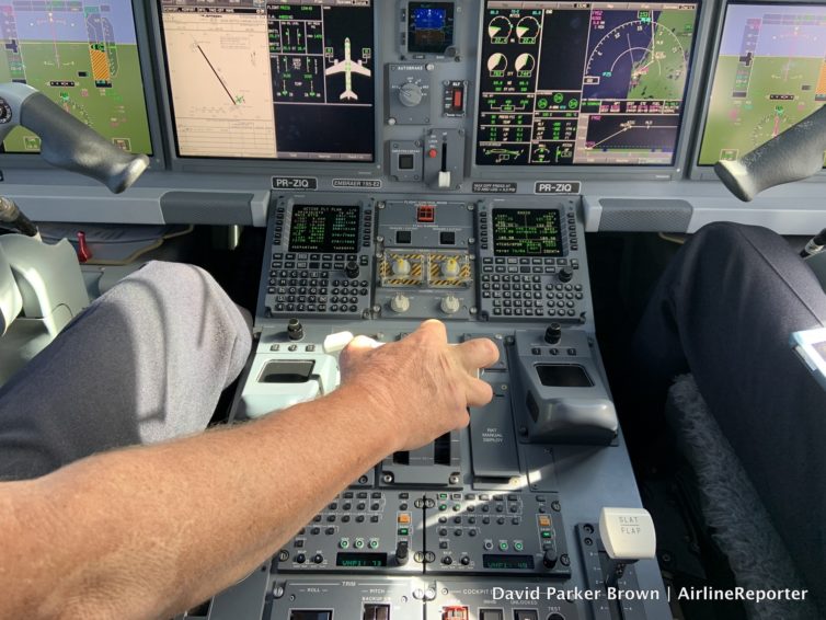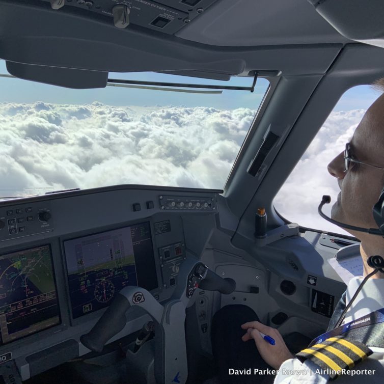We lifted off very quickly. And I was told later that they actually delayed the takeoff so folks on the ground could get some photos. An almost empty E195-E2 sure is one rocket! Once we lifted off, the captain encouraged me to put on some headsets so we could chat. Heck yes! Now I could start asking about all the things I have been watching: how the autopilot worked, the TCAS system, how they would handle an emergency, and just about the plane in general. Talking about planes anywhere is cool, talking about them while flying in a cockpit is hard to beat!