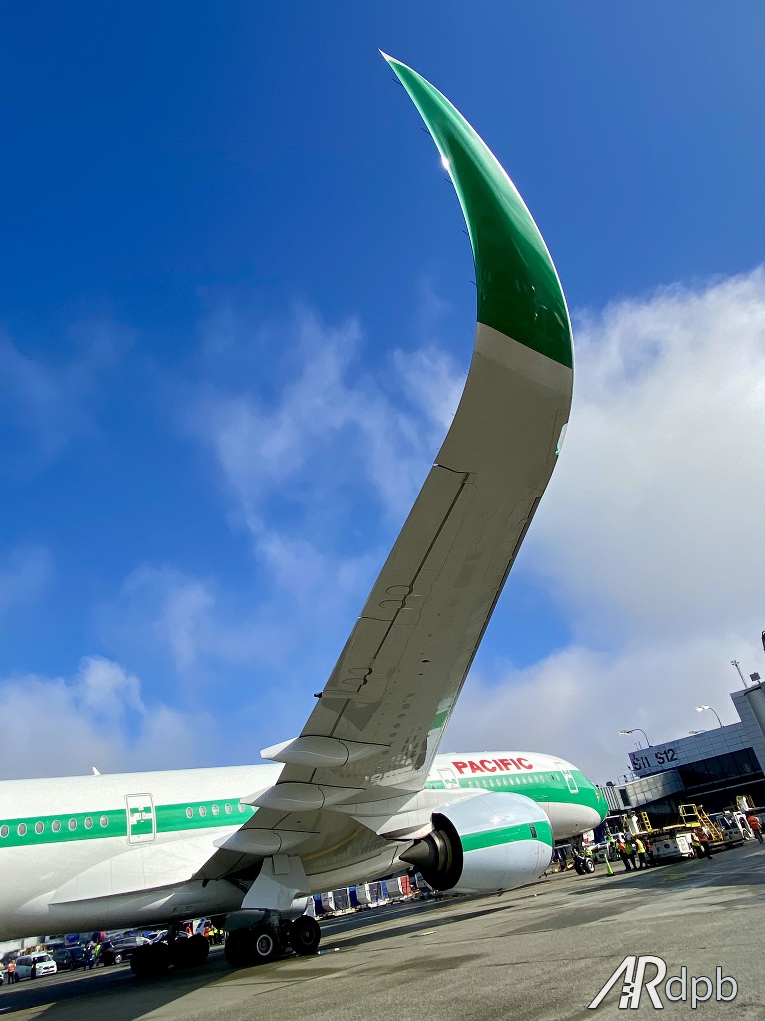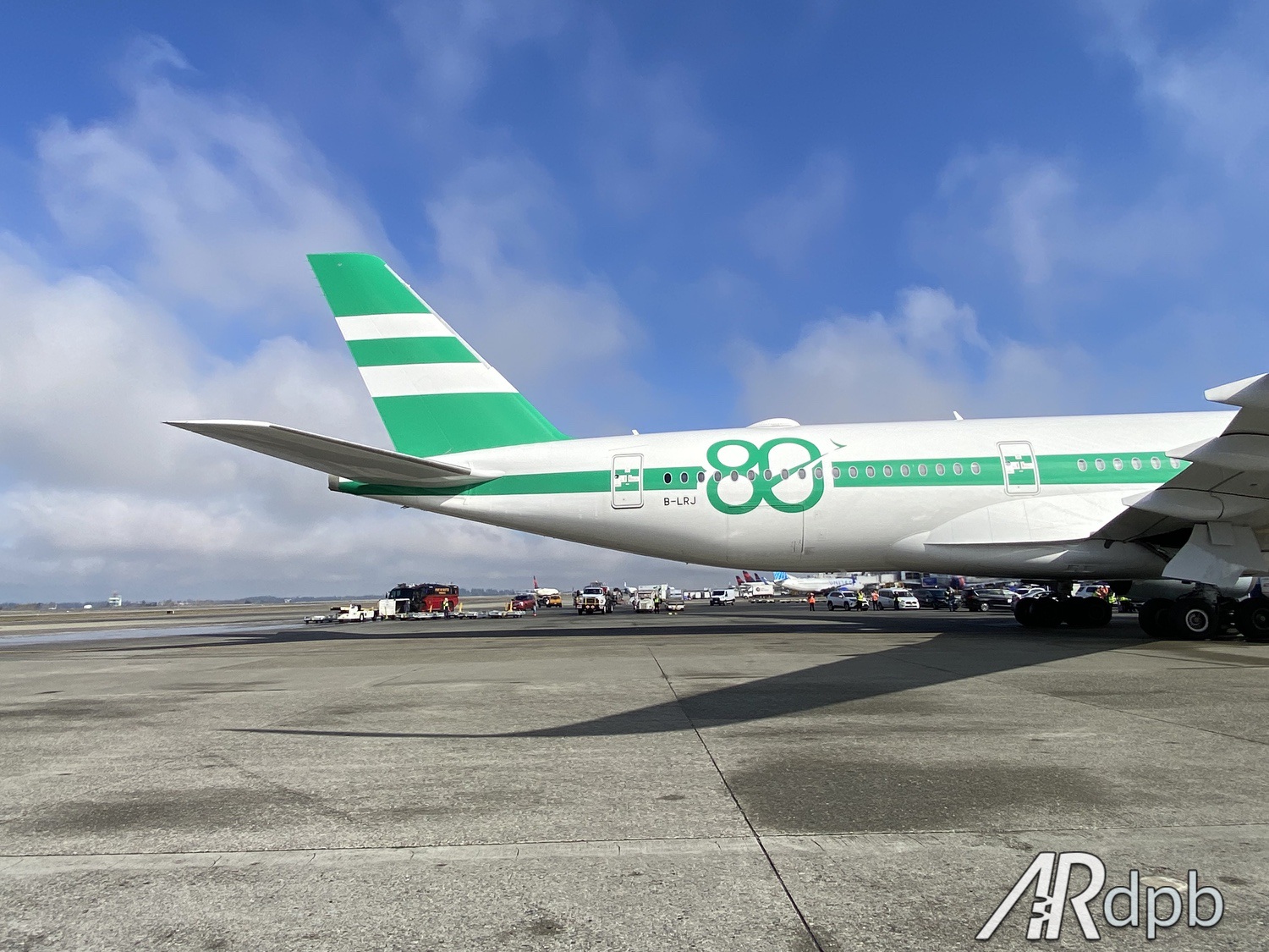 Soon Cathay’s stylish A350 retro livery landed and was set up for the water cannons. It was perfect timing since the airport was foggy while we waited for the flight, but the sun burst through the clouds hitting the bright green paint just after the streams of water were shut off. The green sparkled in the sun — it was beautiful!
